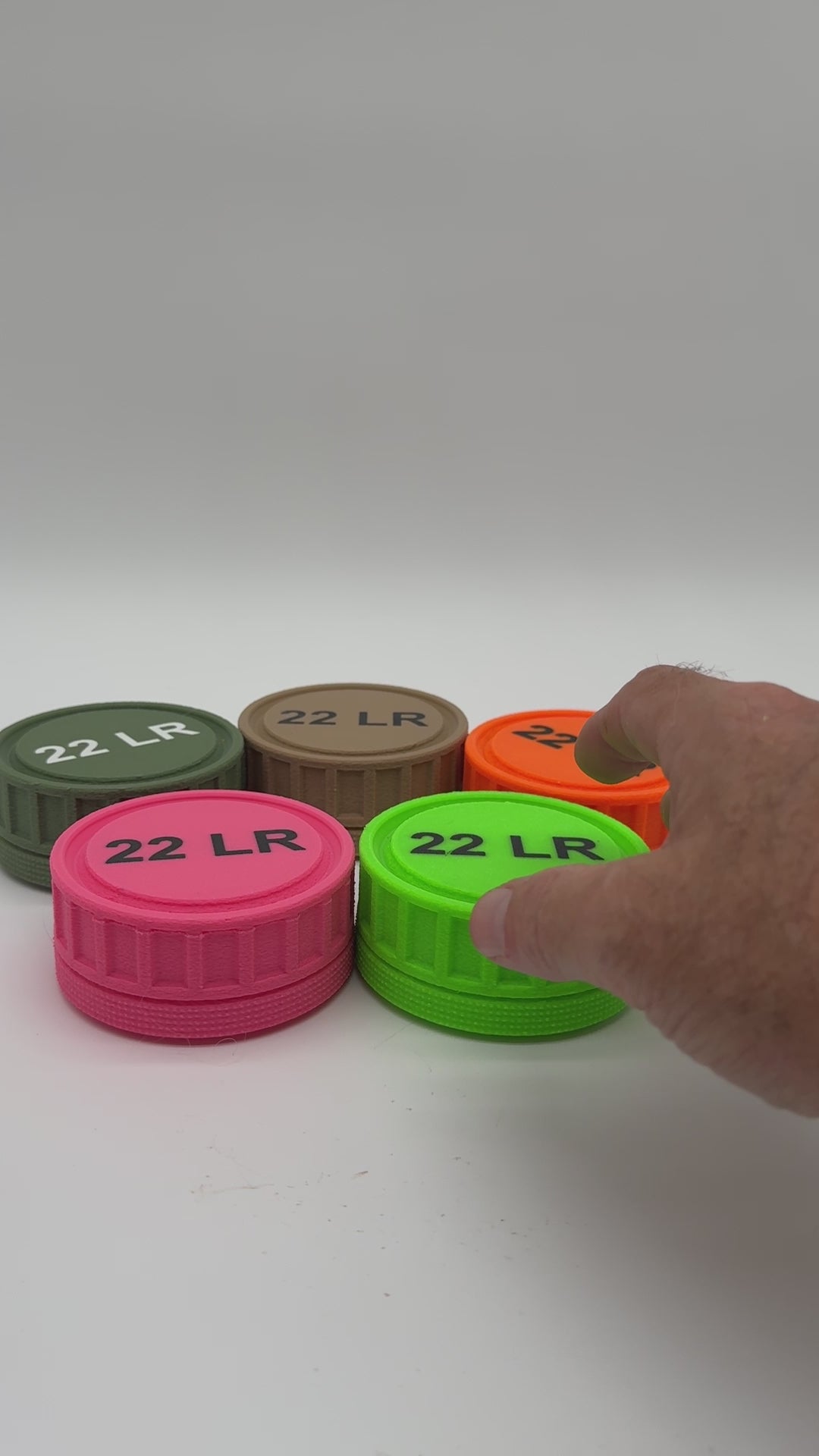 Ammo Box for 22 LR ammo, keep 50 rounds safe and secure. Throw in your backpack or put in a pocket. Made in the USA. Easily stackable. Fluted and knurled exterior for better grip.
